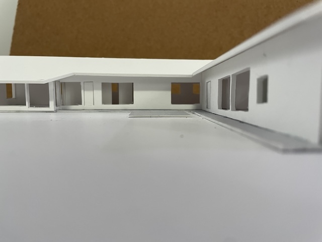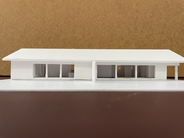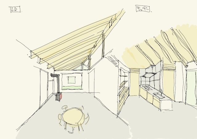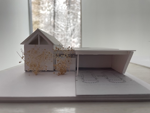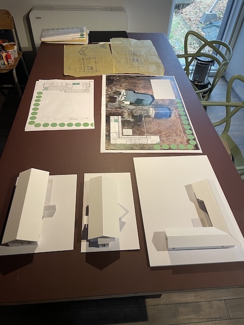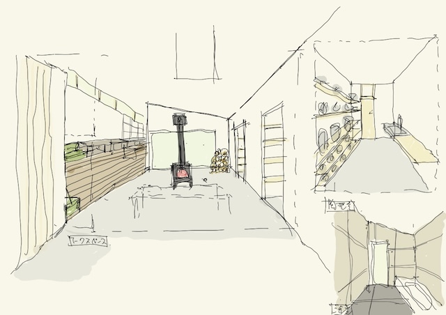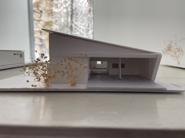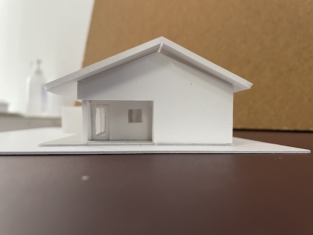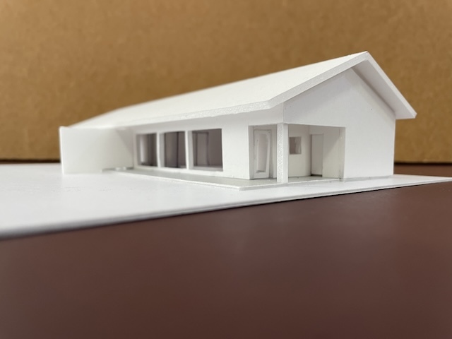 私の建築の制作プロセスは、まずライフスタイルを確認するためのインタビューシートでヒアリングを行い、その内容をA3用紙1枚にまとめます。その紙を常に確認できるようにして、2〜3ヶ月ほど眺めながら、敷地の様子を思い出しつつ、建物の配置や部屋の位置、窓の向き、建物の形状などに思いを巡らせます。その後、ノートにアイデアを描き出し、しっくりくる3つの案を選んで仕上げていきます。平面図を検討しながら、同時に外観も立ち上げていき、何度も調整を重ねて、ある程度骨格が固まった段階で模型を制作します。模型を作りながらさらに修正を加え、形にしていきます。模型が完成したら、空間を数枚のイメージスケッチに描き起こし、初回提案へとつなげていきます。写真は現在進行中の南幌町と東川の家の初期提案模型です。現在は、この案を元に次のステップへ進み形状も変化しています。