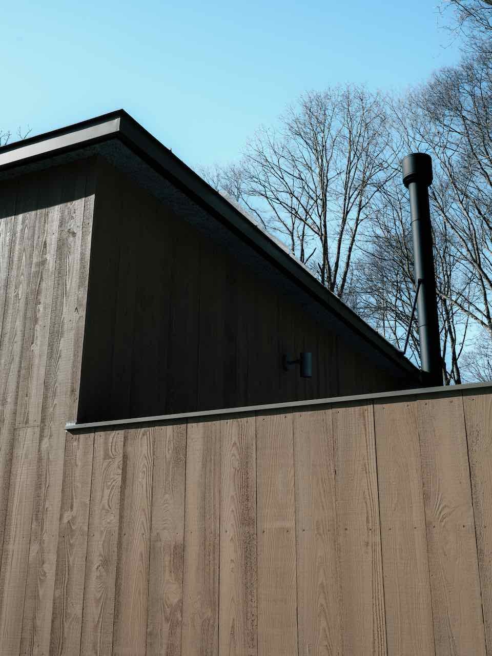 薪は唐松材をメインで使用する事が多いです。理由は、お客様の外装を唐松板貼りではる事が多く、廃材の有効活用で廃材唐松を薪として利用しています。外装材の端材を斧で割り着火しやすくします。斧で唐松端材を割るプロセスも楽しい瞬間です。