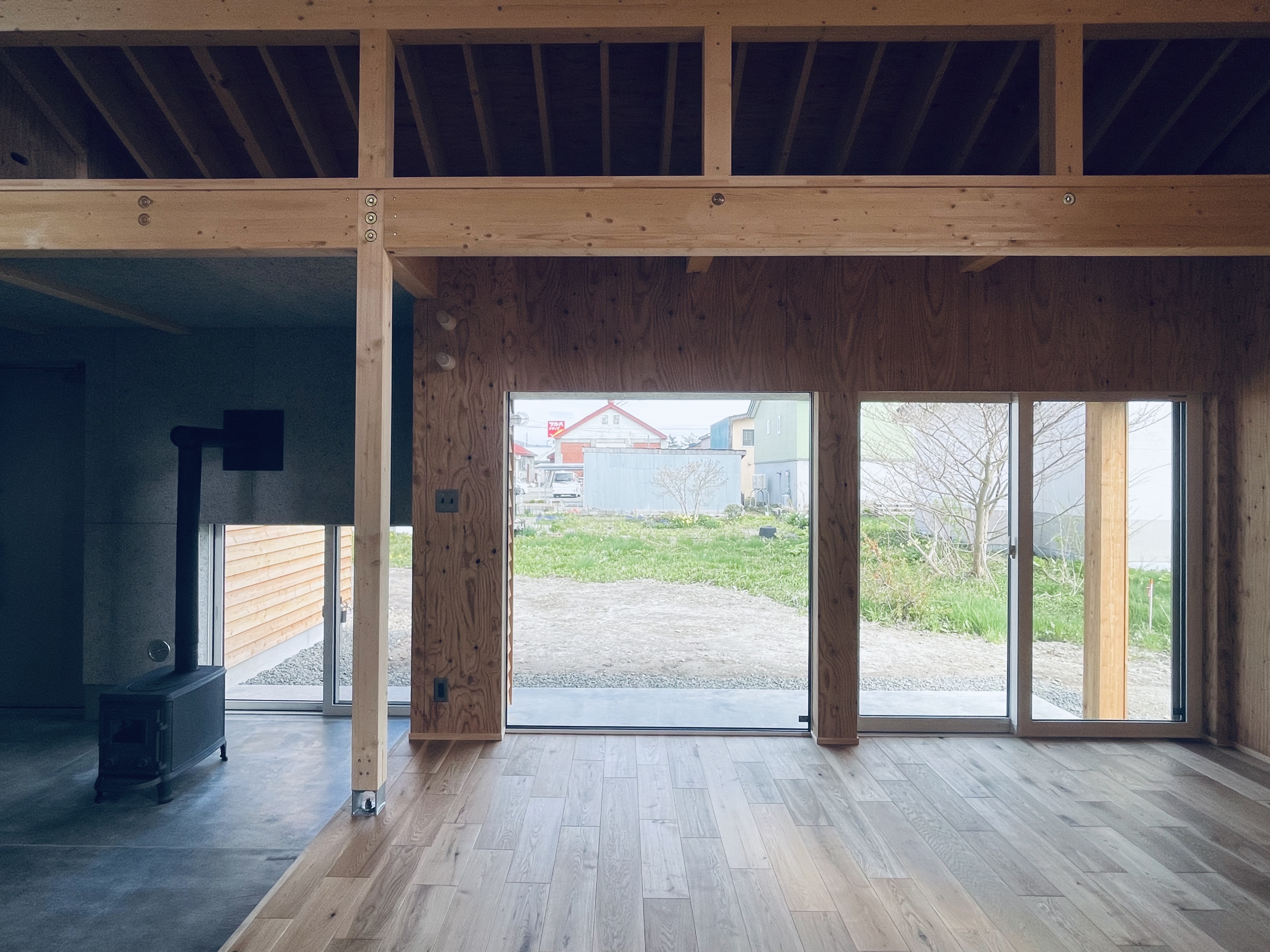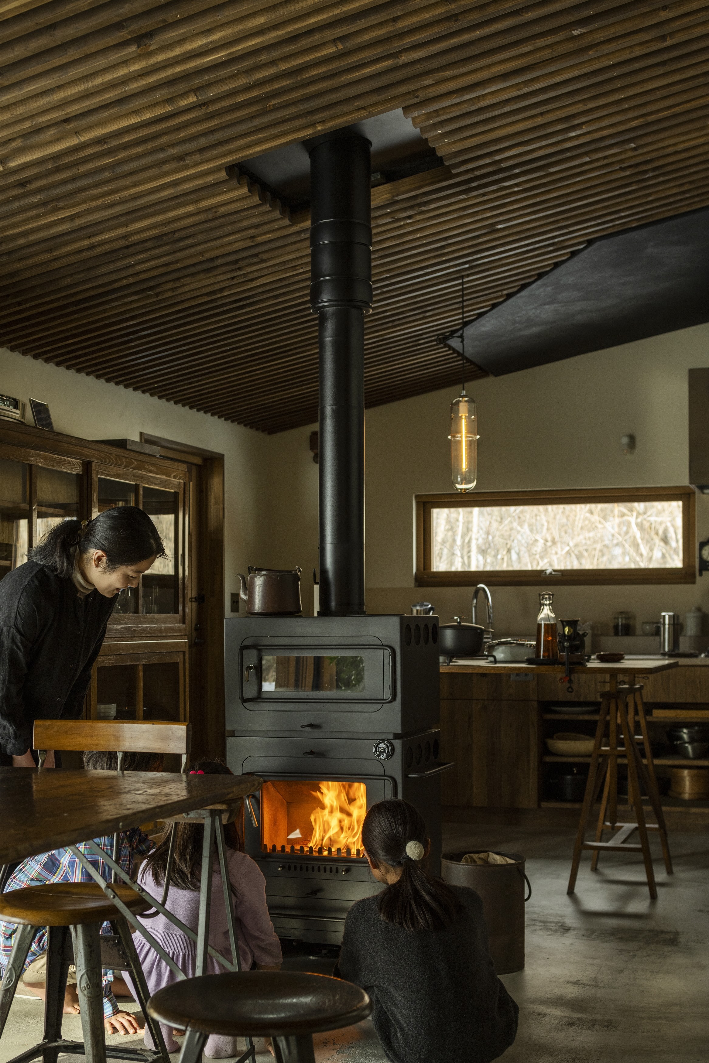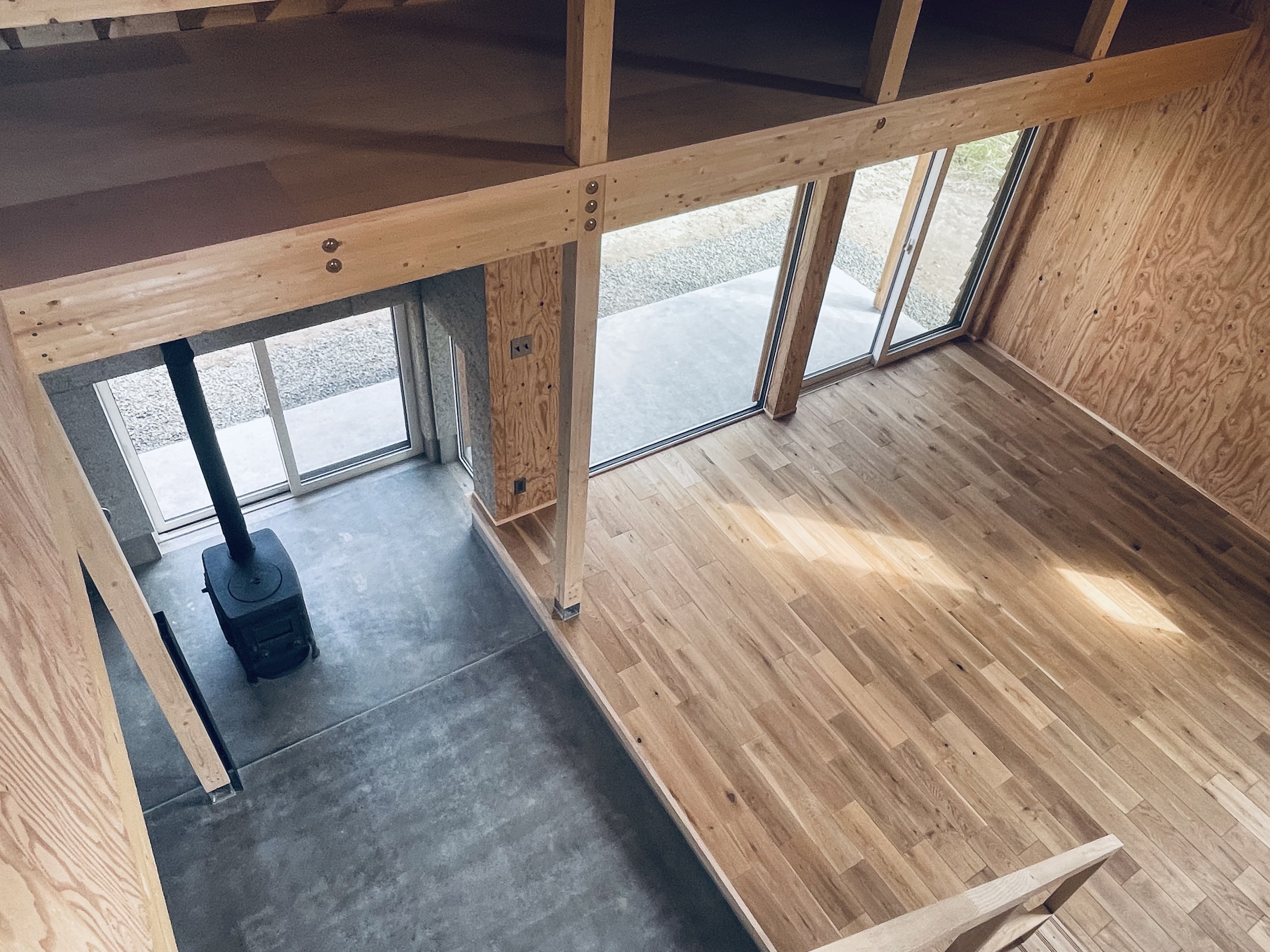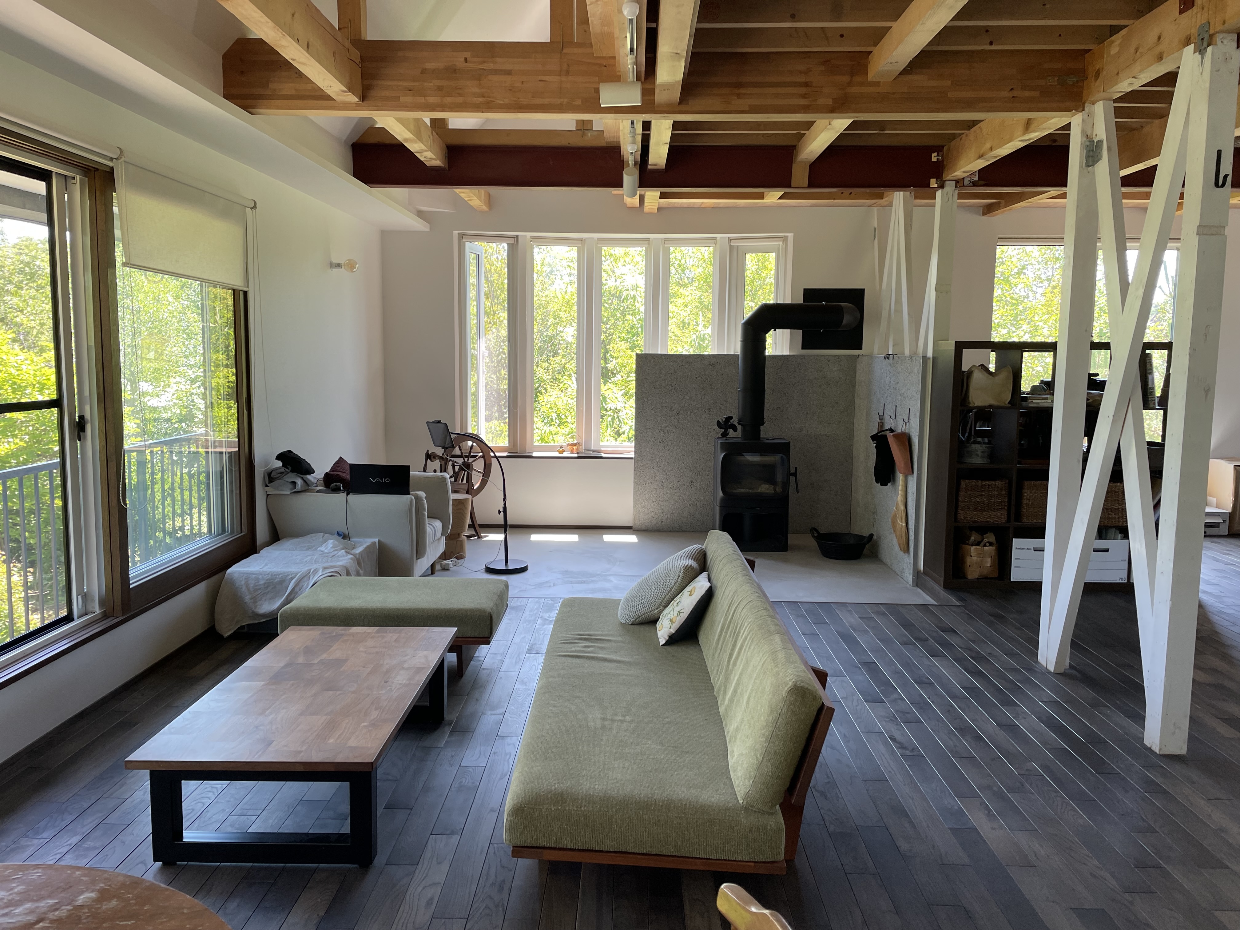 唐松の家は竣工時からリフォームをくりかえしています。2013年の竣工時は、大きなラウンジ空間に大きな窓から望める唐松の木を眺めながら薪ストーブを楽しんでいました。2026年現在は、大きなラウンジは、アウトドアグッズや工具など収納する「ストレージ」と2畳の薪ストーブスペース 私の「秘密基地」に変わっています。薪ストーブスペースは秘密基地となり、一人でゆっくりできるスペースに変わりました。狭い空間で炎を身近に感じ、一人で静かに過ごすには最高です。