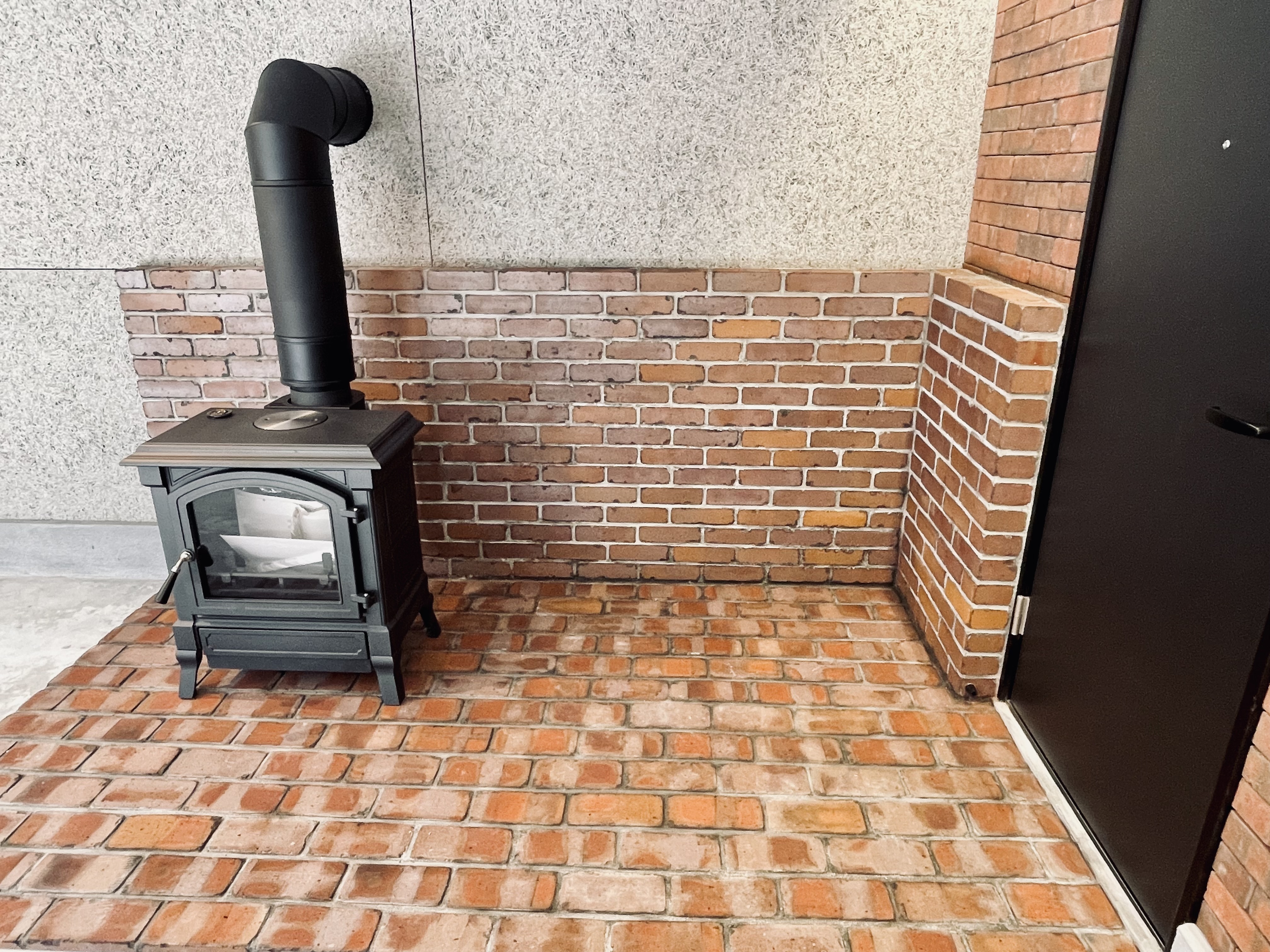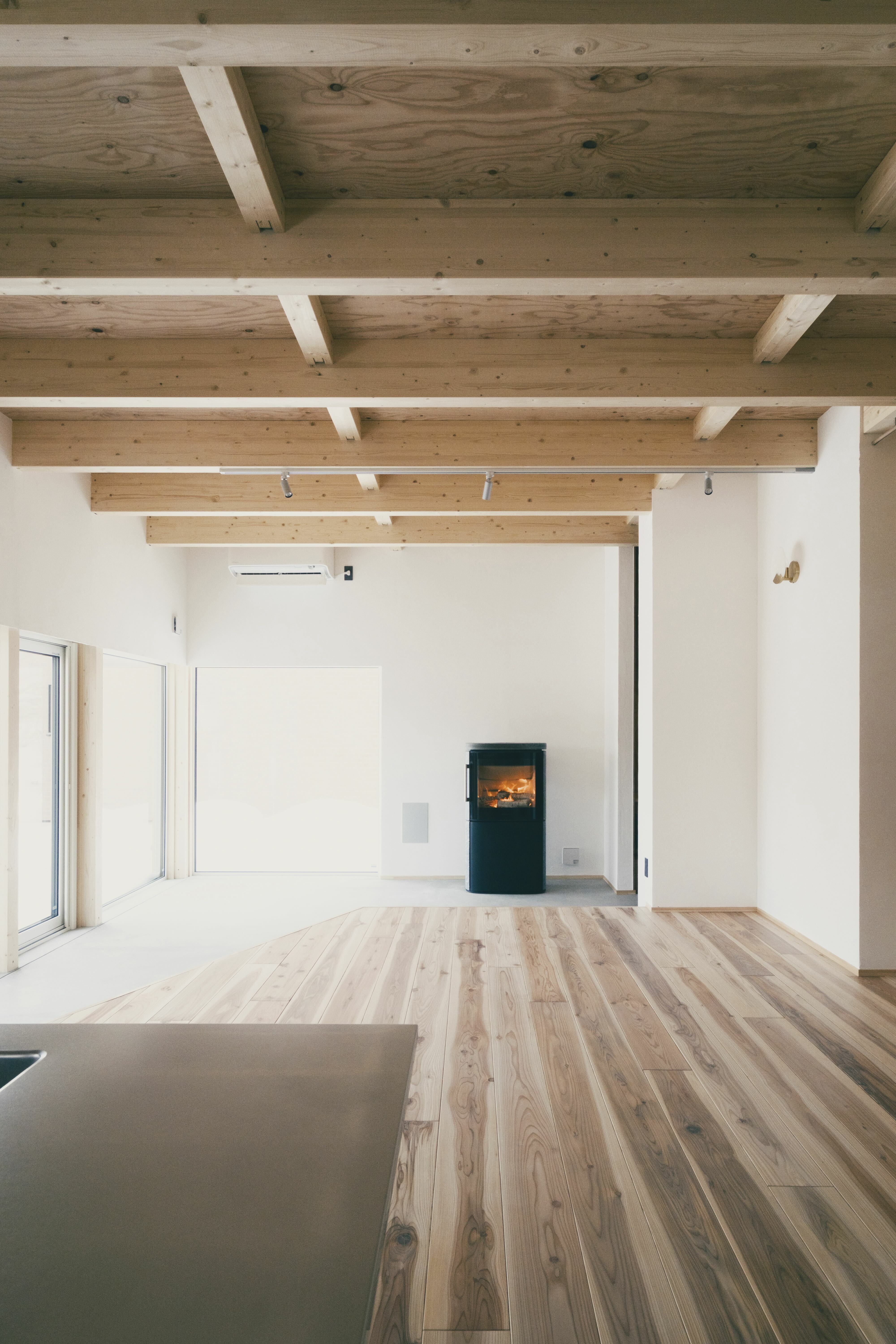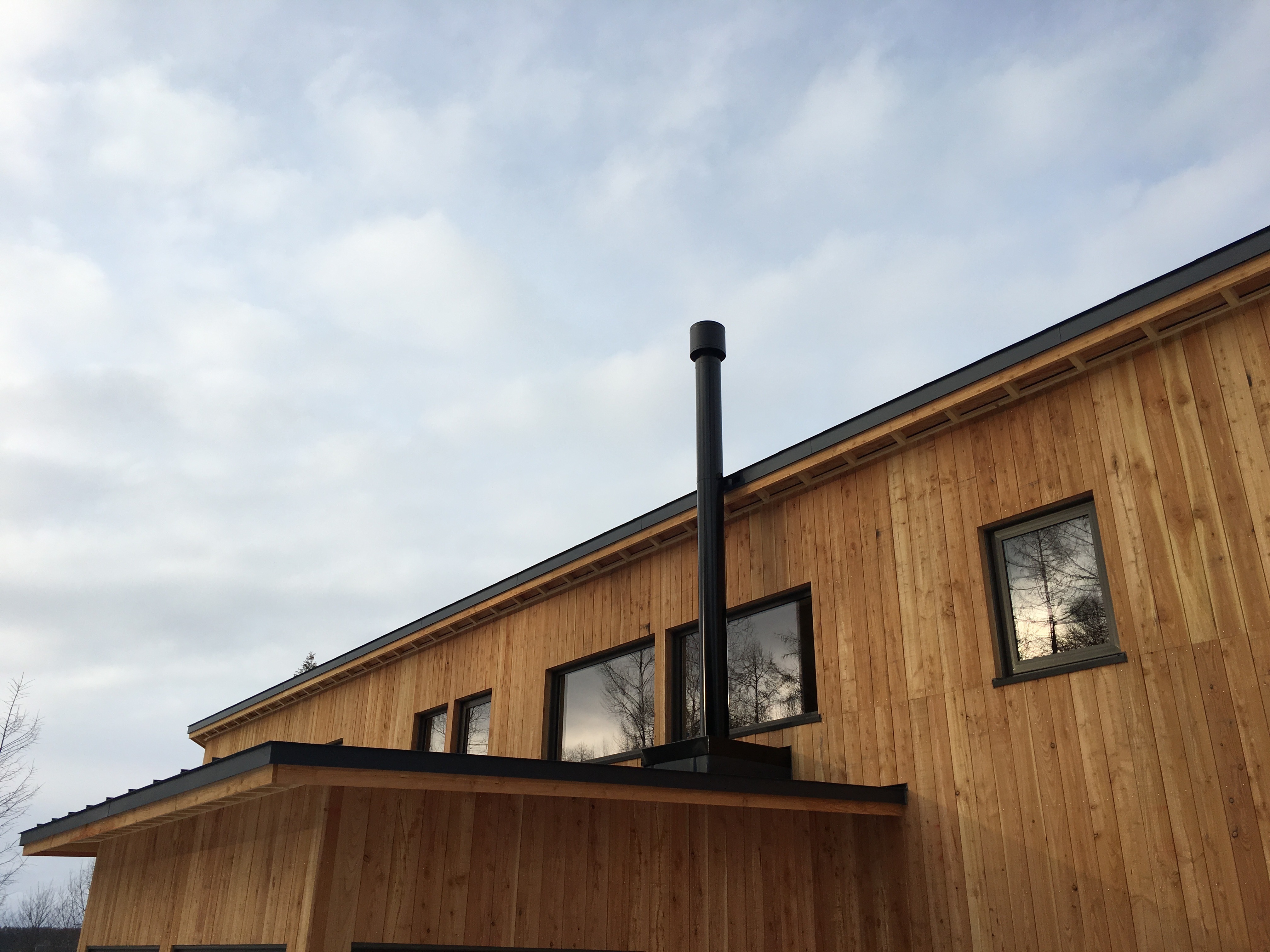 唐松の家は竣工時からリフォームをくりかえしています。2013年の竣工時は、大きなラウンジ空間に大きな窓から望める唐松の木を眺めながら薪ストーブを楽しんでいました。2026年現在は、大きなラウンジは、アウトドアグッズや工具など収納する「ストレージ」と2畳の薪ストーブスペース 私の「秘密基地」に変わっています。薪ストーブスペースは秘密基地となり、一人でゆっくりできるスペースに変わりました。狭い空間で炎を身近に感じ、一人で静かに過ごすには最高です。